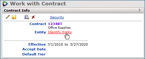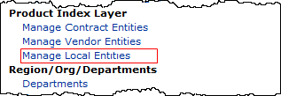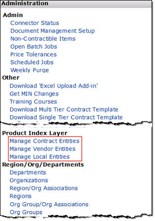 - The main Contents Administration > Product Index Layer > Manage Contract Vendors link (Figure 10). This link also opens the "Vendors and Entities" page. Figure 12 is an example.