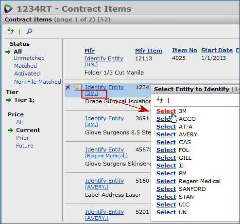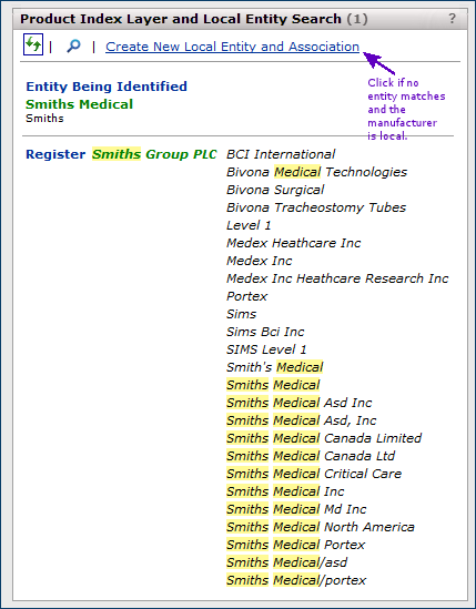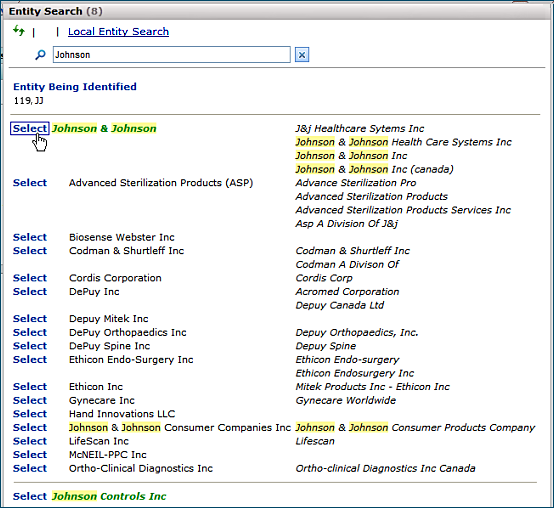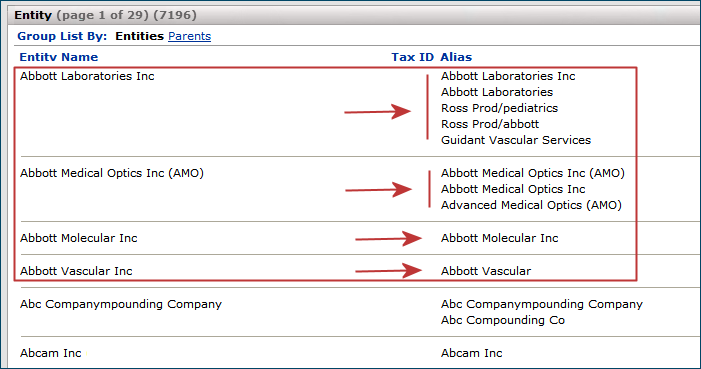 An entity may be simple with only one name associated to one manufacturer or vendor. If the same manufacturer, or vendor, uses different names or has subsidiaries, the entity may include the multiple names as aliases. Figure 1 is a list of entities with aliases. Notice that each of the four Abbott... entities is assigned one or more aliases (red arrows on the right side).