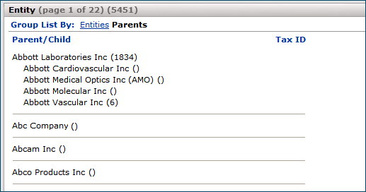 In Figure 1, the entities "Abbott Medical Optics Inc.," "Abbott Molecular Inc.," and "Abbott Vascular Inc." (on the left side) are actually "child" entities of the parent "Abbott Laboratories Inc." The hierarchical structure is illustrated in Figure 2. This kind of entity structure is a "family."