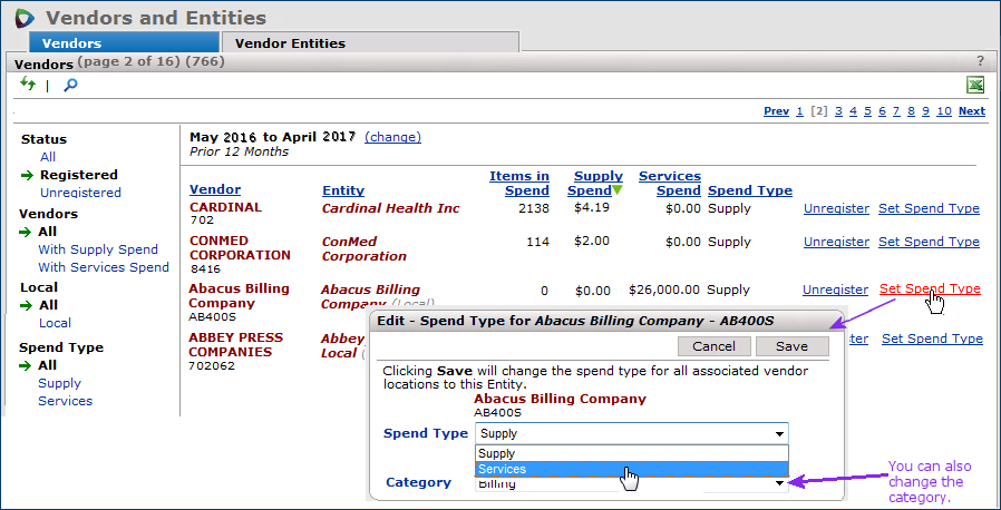 Spend Type: lets you display vendors with both spend types (services and supply); supply vendors only, or services vendors only (as in Figure 39).