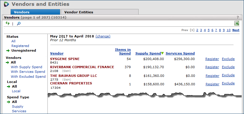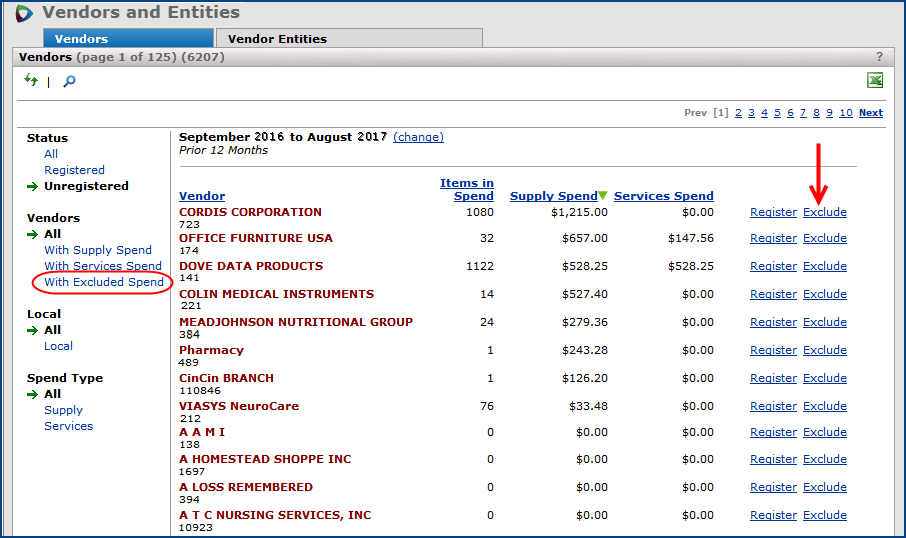 You may have a vendor that cannot be registered as either a supply or services vendor; in such a case, you can exclude a vendor from the Unregistered Vendors list by clicking the Exclude link.
