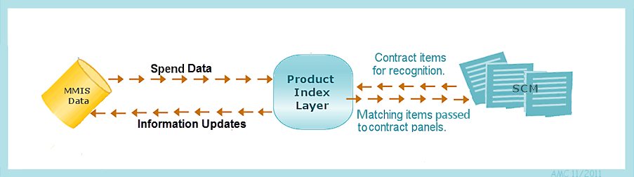 The Product Index Layer reconciles item data from different sources. It is a cross-reference index of item records by manufacturer, manufacturer item number, vendor, and vendor item number that allows contract and hospital items to be matched without intensive data cleansing. Processing associates contractable item catalog records and contract item lines with the corresponding PIL entries.
