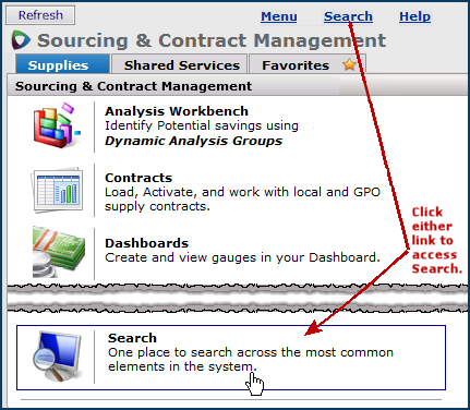 Search is available from the page menu and from the Sourcing and Contract Management main Contents (Figure 5) for contracts.
