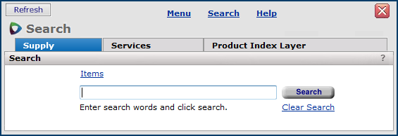 Clicking the Product Index Layer search tab lets you search for an item in the PIL. You can enter characters from the MIN (manufacturer item number), VIN (vendor item number), item description, manufacturer, vendor, UNSPSC, or UNSPSC description. Mouse over the Items link to display a list of elements that are searched.
