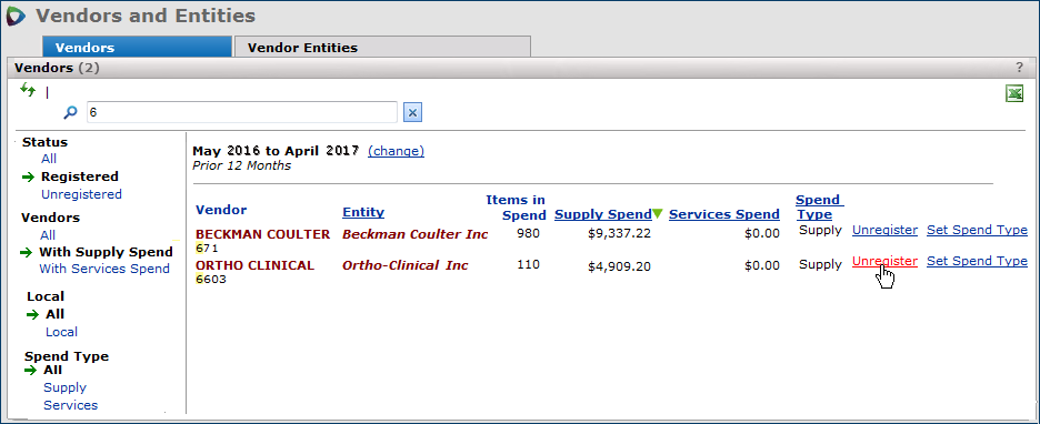 The Vendors list (Figure 12) shows vendor locations, items in spend for each vendor, if any, spend amounts, and more, depending on how the list is filtered. You can use the filters on the left to display registered and unregistered vendors, or all vendors. Other filter options are on the left as well. The default date range is Prior 12 Months, but this can be changed by clicking the change link.