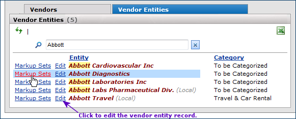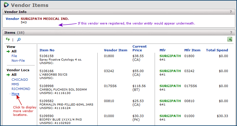 Spend for a vendor's locations is "rolled up" to the vendor entity level. Multiple vendor locations are registered to a single vendor entity.