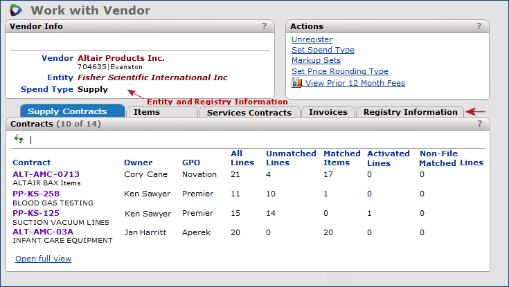 Supply contracts vendors (Figure 43) display the Supply Contracts tab, Items tab, and Registry Information tab. If the vendor is not registered, the Entity and Spend Type fields in the Vendor Info panel do not appear, and a note is on the Registry Information panel. In this case, you may wish to register the vendor. You can do so by clicking Register on the Actions panel.