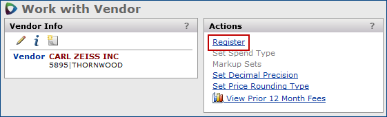 - The "Work with Vendor" page Actions panel (Figure 11) lets you register a single vendor. You can access the Work with Vendor page through the Search application; Search > Vendors > Select a vendor.