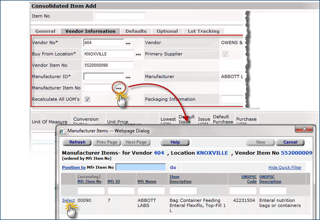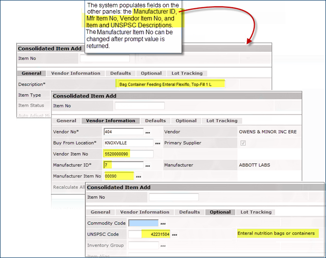 When adding an item to the Item Catalog, you can now use the PIL to find and select the item. On the Consolidated Item Add panel's Vendor Information tab, the Manufacturer Item No (MIN) field lets you select an item from the Product Index Layer. When you select the manufacturer item, the system populates several fields on other panels with PIL data for the item.
