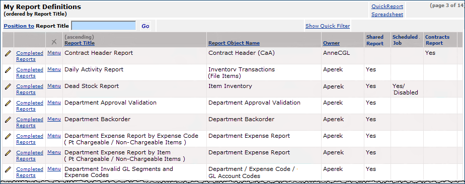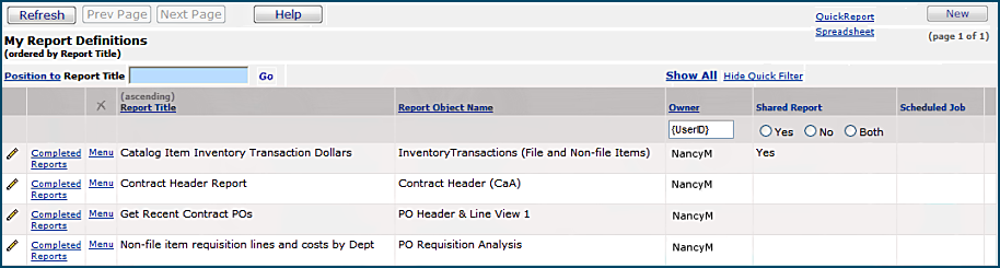 - My Report Definitions - custom report definitions that you have created, or that a colleague has created and shared with you.