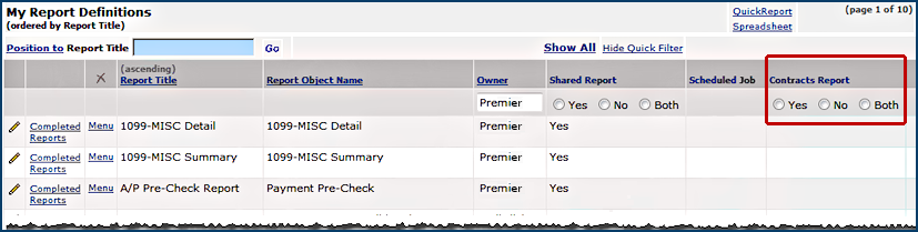 Figure 1 - The Report Definitions Panel with the Sourcing and Contract Management Filter