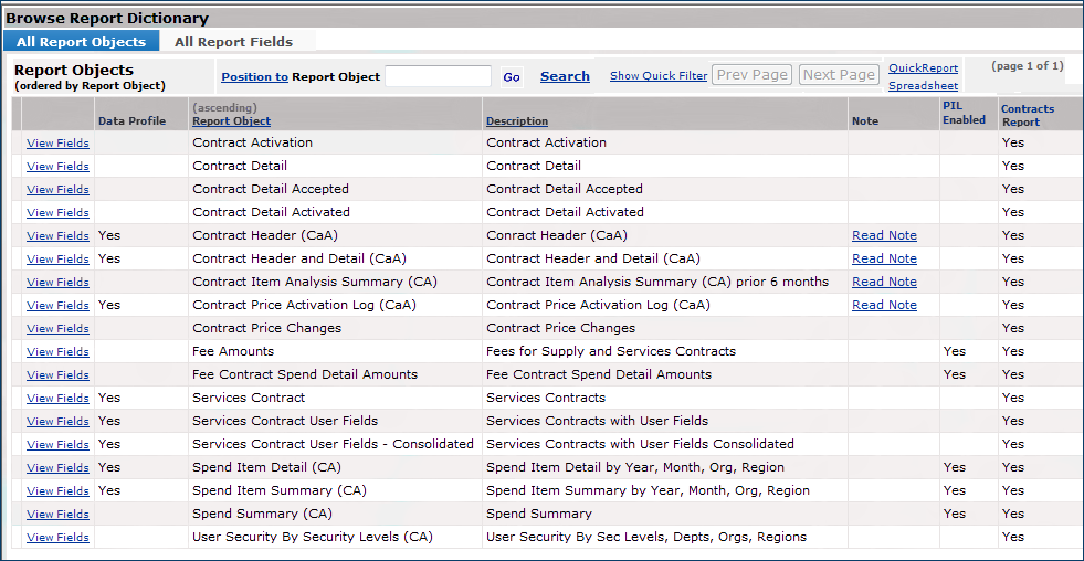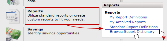 - Browse Report Dictionary - lists Report Objects and fields that are available for creating reports (and are also used in the standard report definitions).