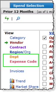 Two additional selectors are available: Dept and Expense Code (GL account). See Figure 1A. To use these selectors (which are not otherwise visible), the application must have your department spend and expense account data populated in its tables from your general ledger. If you wish to analyze spend using the Dept and Expense Code selectors, contact the Solutions Center (aka, HelpDesk) to discuss how to provide the data to SCM. (Stand-alone sites use connectors.)