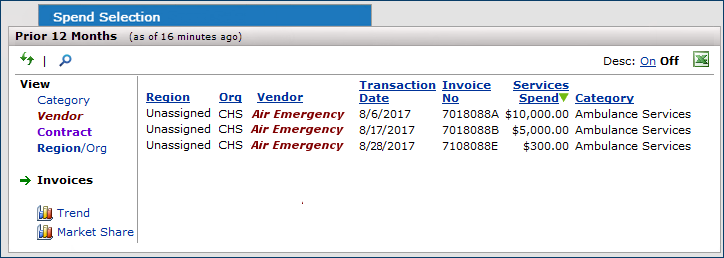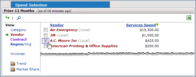 If you know that you have spend for a services vendor, but the spend is not displayed (on the Prior 12 Months panel), the vendor may be unregistered. Spend for unregistered vendors is not available for analysis.
