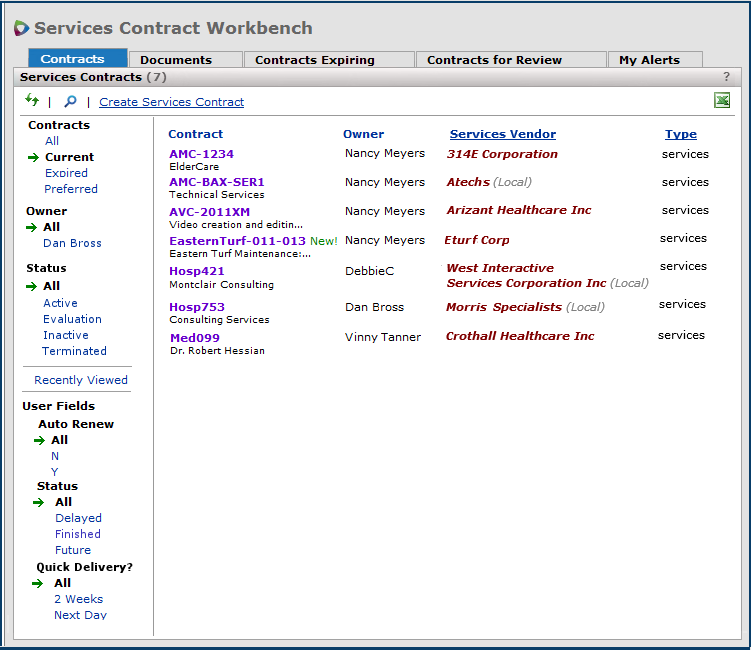 On the Services Contracts list Figure 10 and the Supply Contract list, the values of user fields that you have set up as filters appear on the left under User Fields. Figure 10 is an example for services contracts that contains three user fields as filters: Auto Renew, Status, and Quick Delivery?.