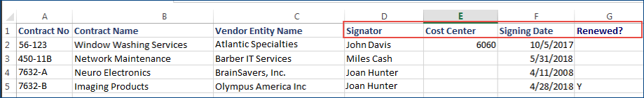 Figure 2A - Sample Excel Output for a Report with User-Defined Fields in Contract Headers
