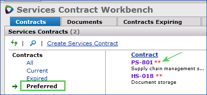 A Preferred filter (Figure 63) is located on the Services Contract Workbench and other panels that list contracts. When this filter is selected, only contracts that have been flagged as Health System Preferred are displayed in the contract list.