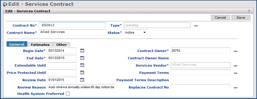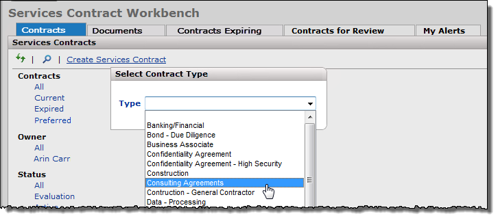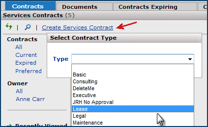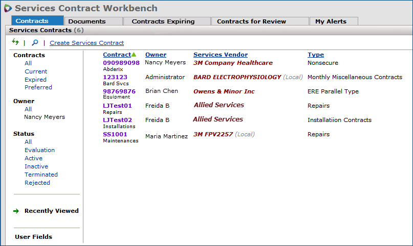 - Services contracts are assigned a type: physician, maintenance, consulting, lease, services, etc.