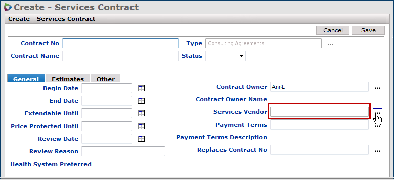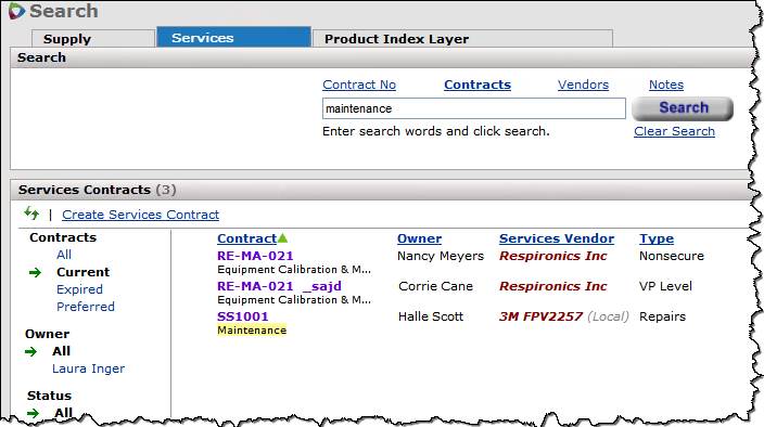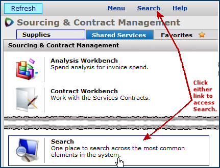 Searching from the "Search" page Services tab and from Supply tab works the same way. See the discussion of search values for valid characters that you can enter in the Search field. As with supply contracts searches, entering All in the Search box for services contracts directs the system to look for all records of the selected type: Contracts, Services Vendors, or Notes.