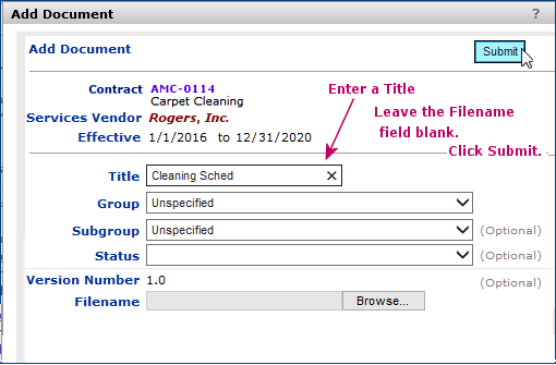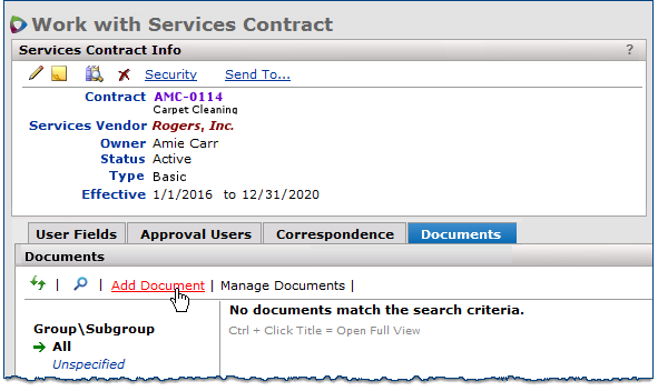 The search routine looks in these fields to find the characters that you entered: Contract Number, Contract Name, Owner, Services Vendor, Type, and the Tags user-defined field.