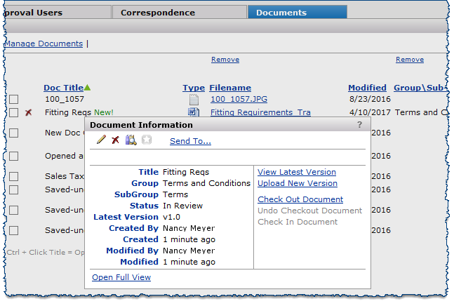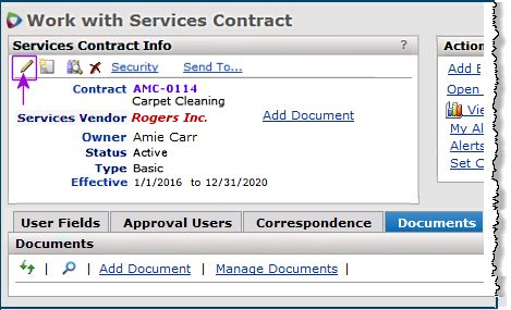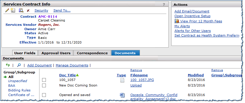 - A Document Information panel provides quick links for editing, deleting, and viewing contract documents.