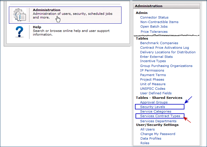 Security levels and services contract types must be defined before you can create services contracts. Initially, these tasks are handled when your system is implemented. However, you can create and maintain security levels and contract types from links on the menu Administration > Tables - Shared Services.