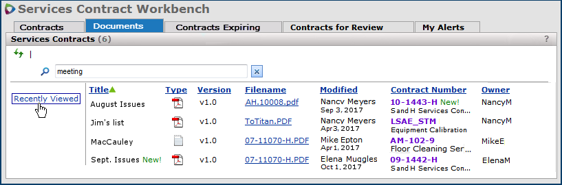 - Recently Viewed: Lists contracts that you have looked at recently. (You cannot use other filters with Recently Viewed.)