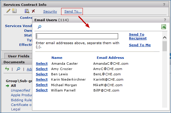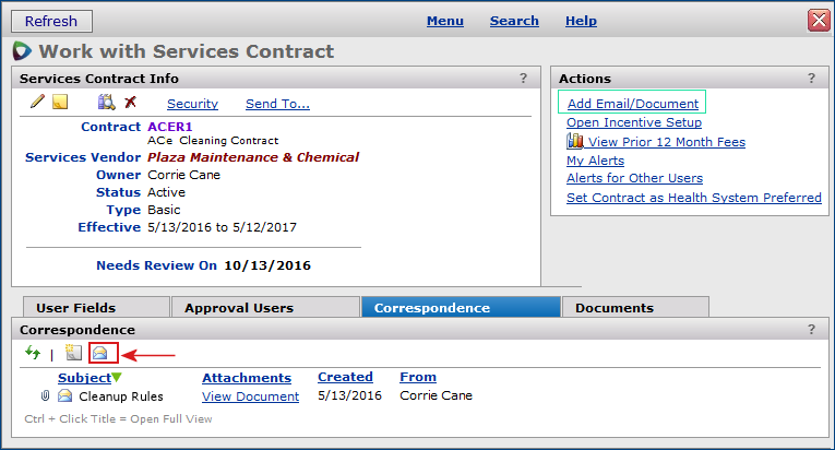 - A Correspondence panel lists emails associated with the contract, and lets you send emails to the contract.