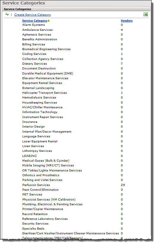 - The category is used to segment and study various kinds of services spend. Examples of vendor categories for which you might have services contracts are: Ambulance Services, Benefits Administration, Billing Services, Dietary Services, Document Destruction, Housekeeping, Interior Design, Linen Services, and many more. Appendix A displays part of the list available from the Administration menu.