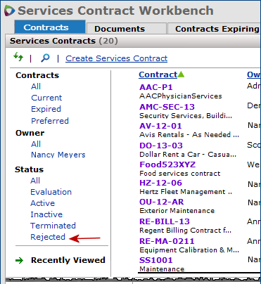 Documents searches are not affected: You can still search for the documents associated with a rejected contract on the Documents panel of the "Services Contract Workbench" page.
