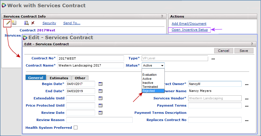 - Status: the status of the contracts (Active, Evaluation, Inactive, or Terminated), Rejected, or All contracts.