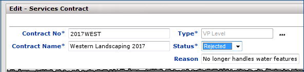- The approval process stops: If approvals are in progress, setting the Status to Rejected stops the approval process. The Click to Approve link on the Approval Users panel for the contract is disabled. Editing of approval users is also disabled. No further emails or approval notifications are sent to approval users. Messages that the contract has been rejected are sent instead, as follows: