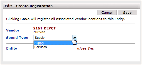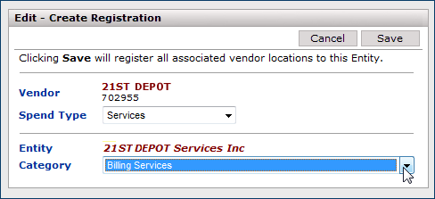 As outlined in the setup paragraphs, shared services contracts are assigned to vendor entities which are cross referenced ("registered") in the Product Index Layer to your vendor locations. When you register a services vendor, you select a service category and a spend type.
