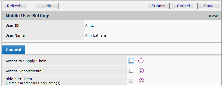 Note: Also, on the User Profile General tab, be sure to set the field for ePHI (electronic personal health information) correctly for the user. This field is Hide ePHI Data. See the online topic "Securing Electronic Protected Health Information" for a discussion of this field.