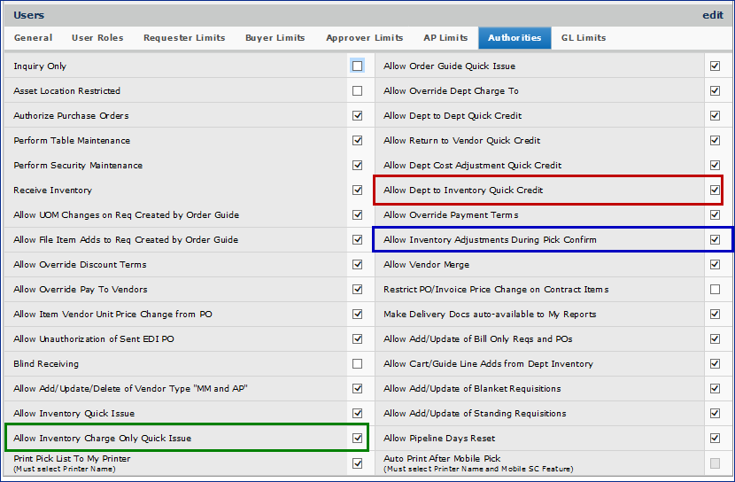 | Distribution | Allows picking and issuing. Controls access to the Picks button on the mobile application. Note: The mobile Picks feature must be enabled for your site by the Help Desk. |