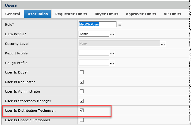 Users who work with mobile applications must have the role "User is Distribution Technician" selected on the User Profile Roles panel.