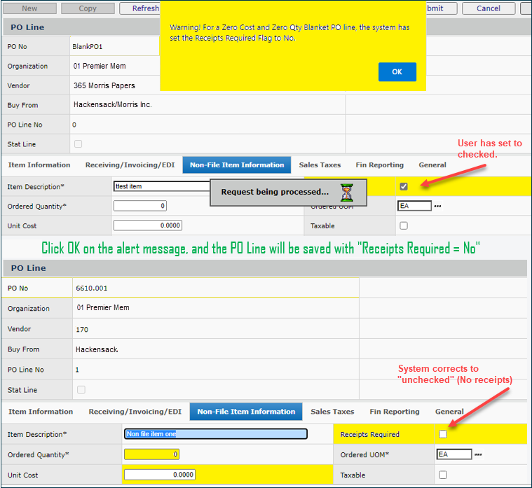 Blanket POs with zero quantity, zero cost, non-file lines: Receipts Required defaults to "off."