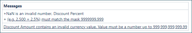 Resolution: When the user does not edit the fields to enter actual percent/dollar values, clicking Save or Submit from an edit of the line automatically defaults these field values to 0.0, and proceeds with no error message.