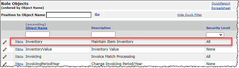 Reinstating inventory items is controlled by the role object "Inventory" when set to All, Modify or Create (Figure 7).