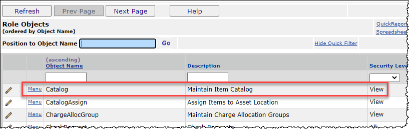 Work in Administration > Administration > Roles > locate role in list > click Role Objects and search for Catalog