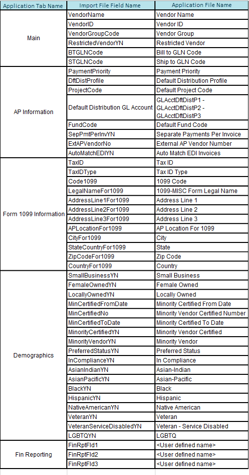 Until this release, only the Vendor ID, Vendor Number and Vendor Name could be updated by using the Vendor Import (Action Code "C"). However, other fields were not getting updated on the vendor record even though new values were passed to the application.