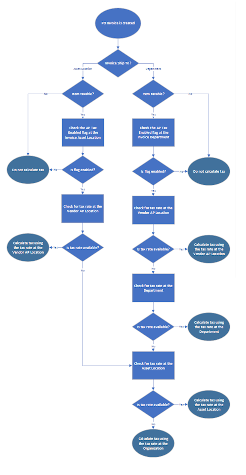 For invoices with the asset location as the Ship To location, if the vendor AP location contains tax data, ERP uses the vendor data to calculate taxes. Otherwise, ERP uses the tax specified for the asset location. Finally, if no tax data exists for the asset location, ERP looks at the organization to determine if it has tax information.