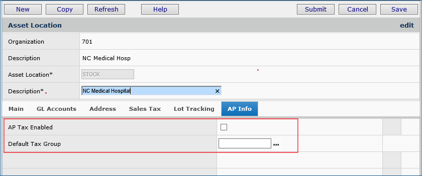 4. To require the calculation of tax on invoices for the asset location, select AP Tax Enabled.