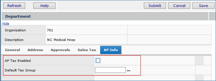 The AP Info panel (Figure 11) on the department record "switches on" a tax requirement and tax calculations for invoices associated with the department.