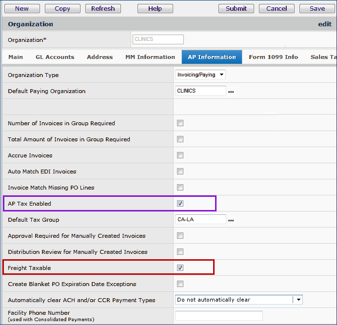 To automatically calculate sales tax on freight charges, select the field Freight Taxable on the organization record's AP Information panel (Figure 9, red box).