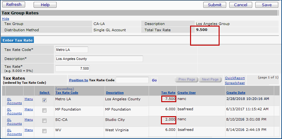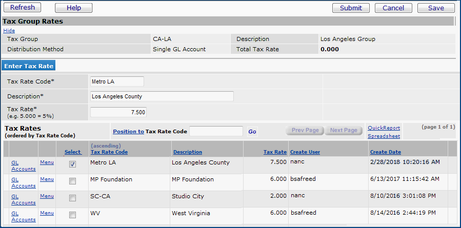 1. Click Refresh. The GL Accounts list appears with the tax rate account included.