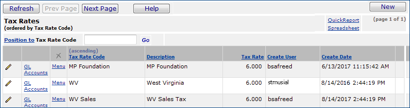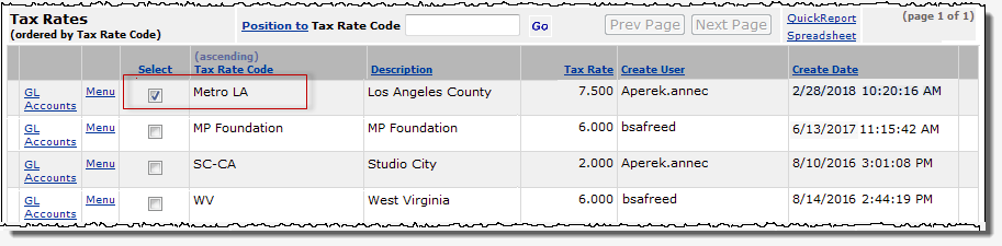1. From the Tax Rate list (Figure 1, Figure 6 or Figure 7), next to a tax rate, select GL Accounts.