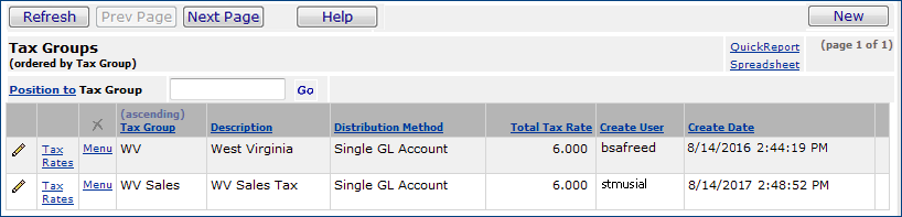 The list of tax rates appears (Figure 1), or No Data if no tax groups exist.