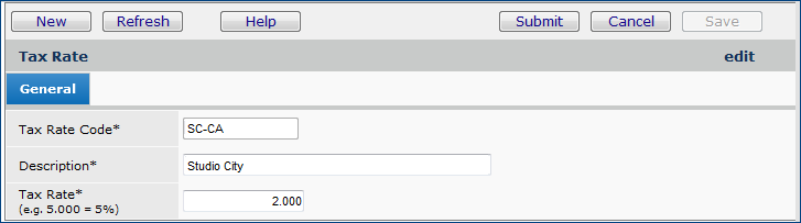 Use this panel to give the new tax rate an identifier -- enter a Tax Rate Code and Description -- and set the percentage in the Tax Rate field.