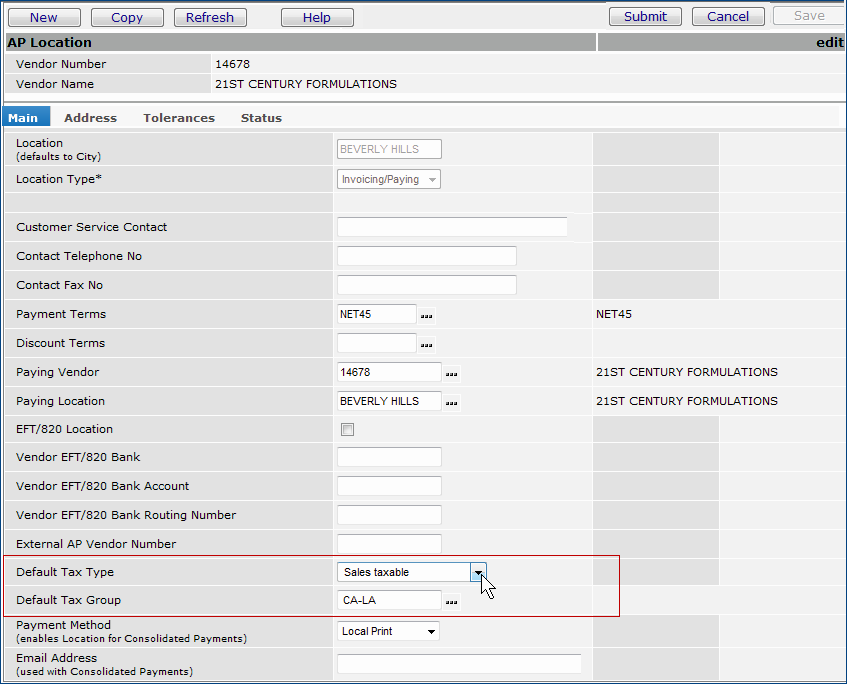 1. Select the Default Tax Type for the vendor AP location. Options are: Sales taxable, Use taxable, Non-taxable.